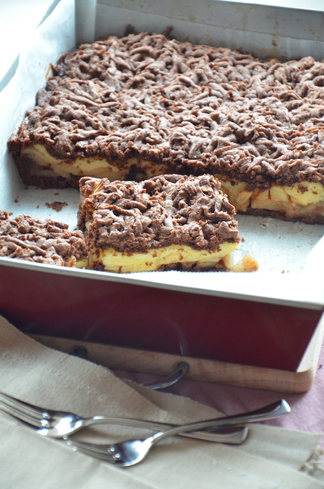 Jeśli chodzi o jabłecznik, to najlepszym i najsmaczniejszym jabłecznikiem, jest jabłecznik mojej babci. Więcej jabłek niż ciasta. Rozpływający się w ustach. Przepyszny. Cały czas dążę do tego, aby upiec taki jabłecznik jaki piekła moja Babcia. Do ideału mi jeszcze daleko. Dlatego też eksperymentuję w kuchni. Jednym z takich eksperymentów jest czekoladowy jabłecznik z budyniem. Spróbujcie. Nam smakuje – nawet bardzo.