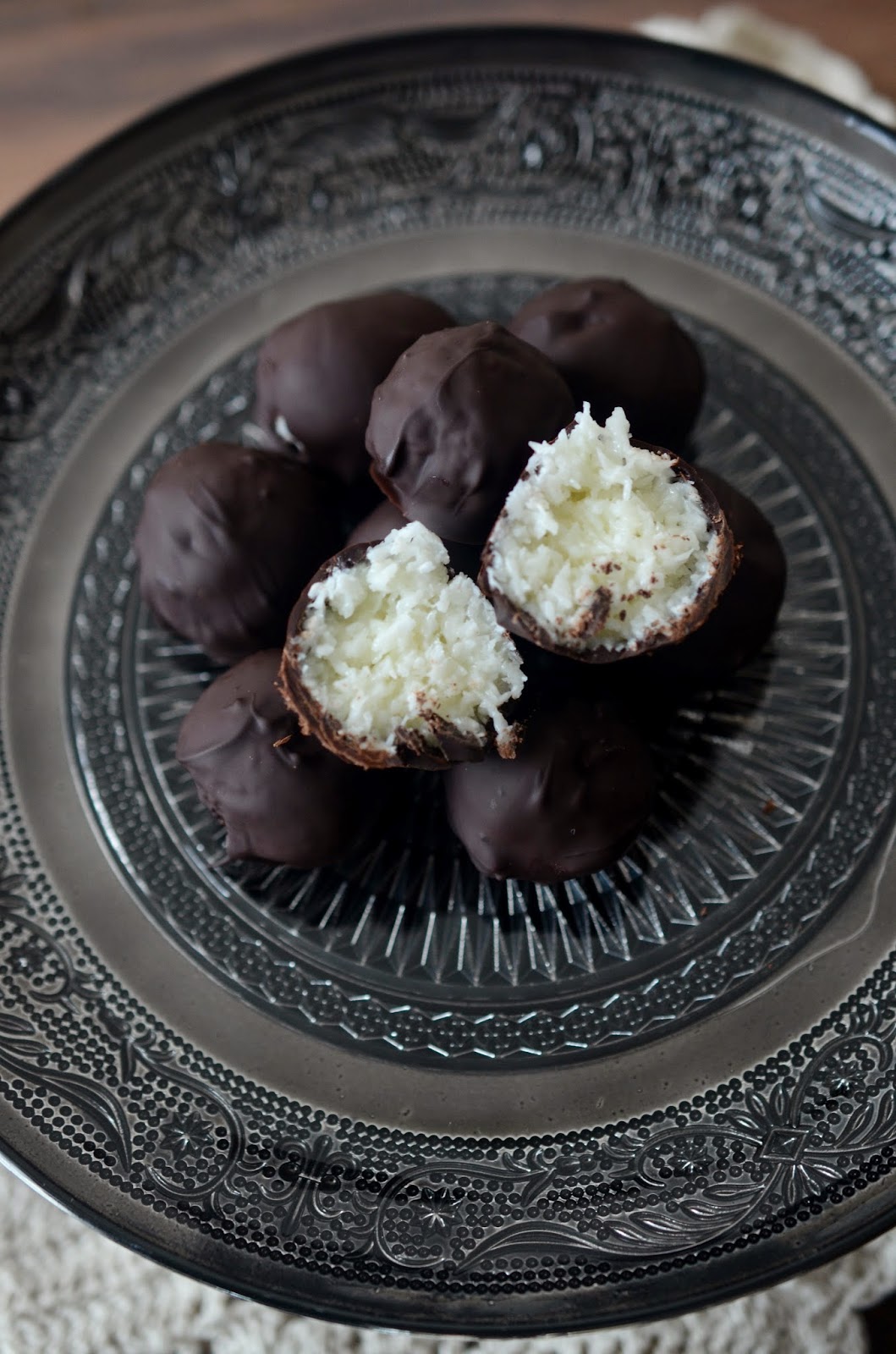 Moje pierwsze kokosowe kulki z czekoladą. W smaku przypominają znany nam kokosowy baton Bounty, który uwielbiam, szczególnie w wersji z gorzką czekoladą. Dzisiaj właśnie w takiej wersji. Oczywiście jeśli nie lubicie gorzkiej czekolady, zastąpcie ją mleczną, deserową, białą – do wyboru, do koloru. Pyszności.