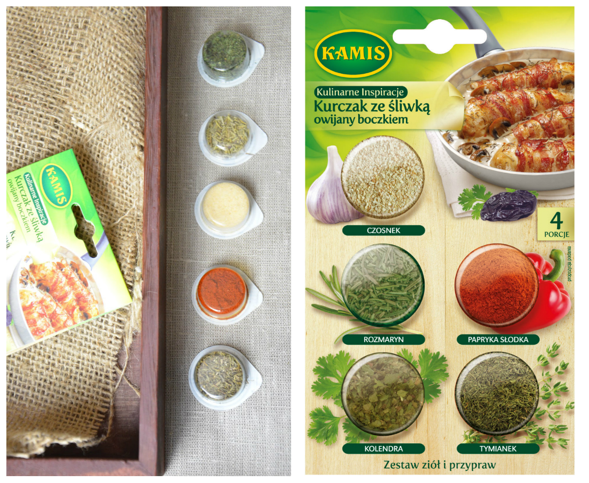 Moje pierwsze podejście z Kulinarnymi Inspiracjami Kamisa. Na pierwszy ogień poszła mieszanka przypraw do kurczaka ze śliwką, owiniętego boczkiem. W skład przypraw wchodzi: czosnek granulowany, papryka, tymianek, rozmaryn i kolendra. Rozwiązanie to jest bardzo przydatne dla osób, które mało gotują w kuchni a chcą zabłysnąć np podczas kolacji dla znajomych. Plusem tego zestawu jest to, że wykorzystujemy wszystkie przyprawy, dzięki czemu nic nam nie zostaje i nic nie wietrzeje. Bo wiadomo, im dłużej przyprawy zostają nieużywane, tym szybciej tracą swój aromat i smak. Kurczak ten smakował nam bardzo i do tego pieczone ziemniaczki – czego chcieć więcej?