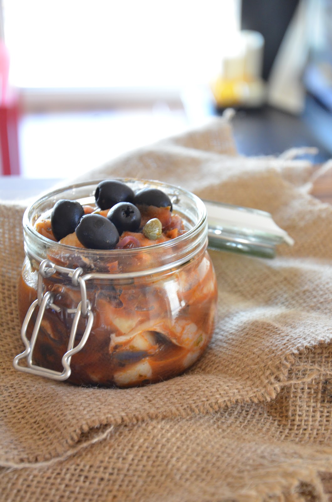 Cebulę pokroić w piórka, zeszklić na oleju. Dodać oregano, pieprz i sól. Przesmażyć. Dodać oliwki i kapary. Przesmażyć 1 minutę. Następnie dodać przecier pomidorowy i dokładnie wszystko przesmażyć, aż składniki i smaki się połączą. Jeżeli sos będzie się rozwarstwiał, dodać kilka łyżek wody.