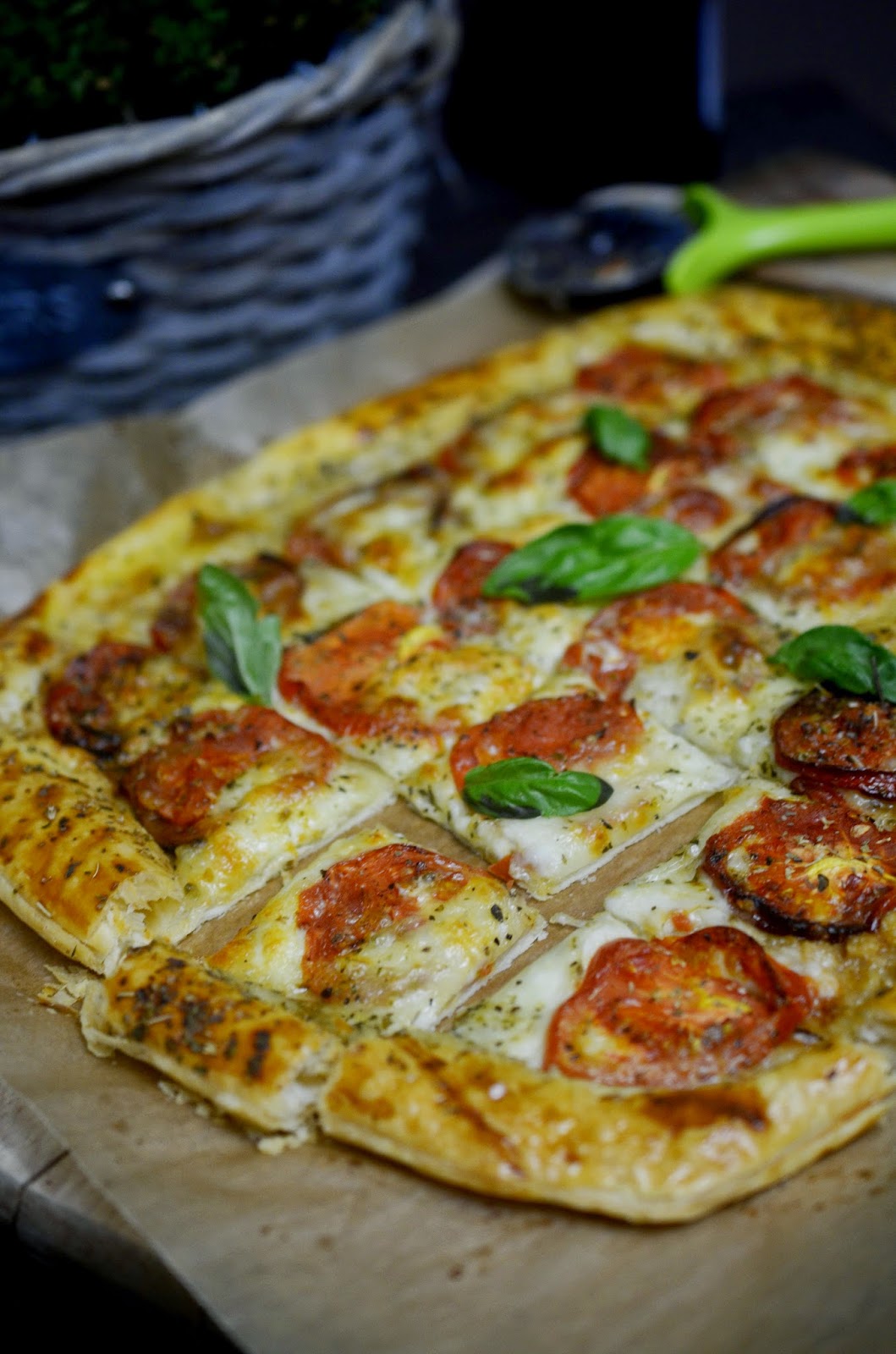 Szybka alternatywa do domowej pizzy. Wystarczą 4 składniki : ciasto francuskie, pomidory, czosnek i mozzarella i pyszna tarta gotowa. Polecam z czystym sumieniem. Dobra zarówno na ciepło i na zimno. Pieczone pomidory nadają delikatnego smaku tarcie. U nas zostaje na dłużej i będzie dobrą opcją, kiedy będziemy mieć ochotę na pizzę, a nie będziemy mieć za dużo czasu na jej wykonanie.